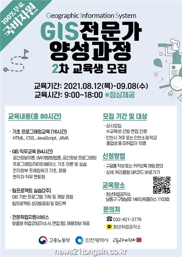 인천광역시(시장 박남춘)는 ‘청년취업공작소’와 연계해 관내 청년구직자를 대상으로 8월 11일(수)까지‘GIS 전문가 양성과정’ 2차 교육생을 모집한다고 밝혔다.