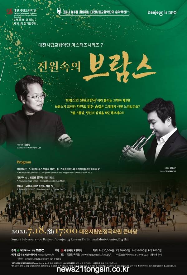 대전시립교향악단은 7월 18일(일) 마스터즈시리즈 7을 대전시립연정국악원에서 이병욱의 객원지휘로 연주한다.