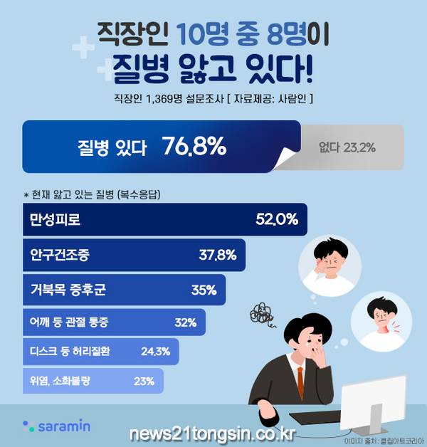 구인구직 매칭 플랫폼 사람인(www.saramin.co.kr, 대표 김용환)이 직장인 1,369명을 대상으로 ‘건강 실태’를 조사한 결과, 76.8%가 한 가지 이상의 질병을 앓고 있는 것으로 나타났다.