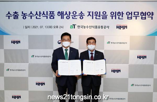 HMM(대표이사 배재훈)과 한국농수산식품유통공사(이하 aT)가 ‘수출 농수산식품 해상운송 지원을 위한 업무협약’을 13일 체결했다고 밝혔다.
