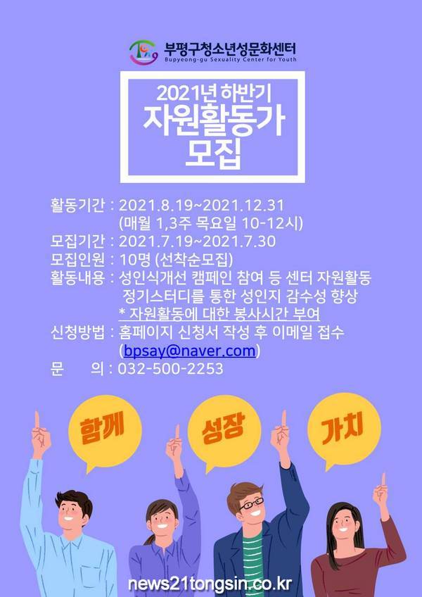 이정호 부평구 청소년성문화센터장은 “2021년 하반기 자원활동가 모집을 통해 지역 내 아동·청소년의 성문화 및 사회적으로 장착된 성의식을 점검하고 개선 할 수 있는 역량을 갖춘 자원활동을 기대한다”고 말했다.
