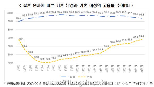 기혼 여성이 결혼 당시 고용률을 회복하기까지 21년이 걸린다는 분석이 나왔다.