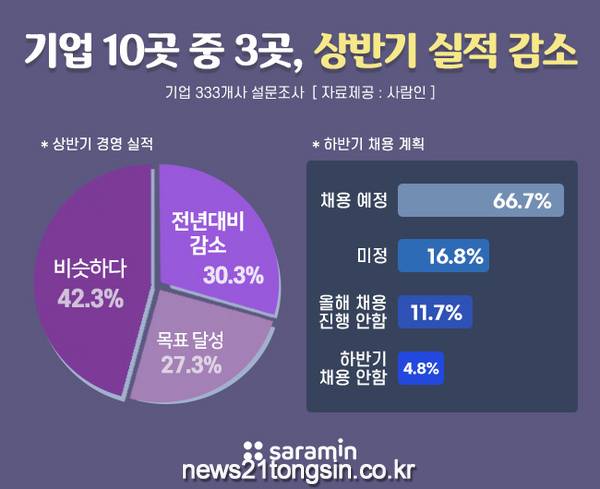 상반기 경기 회복에 대한 기대심리가 높아졌지만, 코로나19가 재확산되면서 다시 기업 경영에 비상등이 켜졌다. 채용 진행여부에도 관심이 쏠리는 가운데 구인구직 매칭 플랫폼 사람인(www.saramin.co.kr 대표 김용환)이 기업 333개사를 대상으로 ‘상반기 경영실적과 채용’에 대해 설문조사를 실시했다.