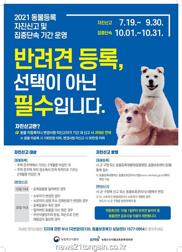 김규태 농업축산과장은 “동물등록을 하지 않으면 100만 원 이하의 과태료를 부과받을 수 있고 변경신고를 하지 않은 경우에도 50만 원 이하의 과태료가 부과될 수 있으므로 기간 내 신고 시 과태료가 면제되는 자진신고 기간을 이용할 것을 당부한다”고 말했다.