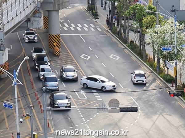 구는 SK뷰 아파트 앞 보도 1.1m 축소 및 교통섬 일부 축소를 통해 동측 진행방향 직진 1개 차로 및 유턴차량 대기공간을 추가 확보하였다.