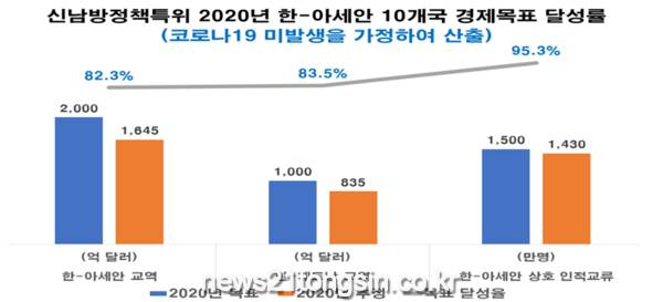정부는 2018년 11월 신남방정책특위 1차 회의에서 2020년 아세안 10개국과 연간 교역 2,000억 달러, 연간 상호 인적교류 1,500만명 달성을 정책목표로 정하고 ①무역·투자 증진 제도적 기반 강화, ②연계성 증진 아세안 인프라 개발 참여 등 5개 경제정책과제를 실행해 왔다.