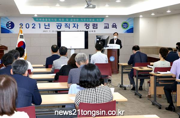 대전광역시교육청(교육감 설동호)는 7월 23일(금) 대전교육청 소속 전 기관의 5급 이상 공무원과 학교장, 교감 및 행정실장 등 1,000여명의 공직자를 대상으로「공직자의 이해충돌방지법」 교육을 실시했다. 이날 교육은 코로나19 확산 방지를 위해 온라인 화상 시스템을 이용하여 보다 많은 직원이 교육에 참여할 수 있도록 집합교육과 온라인 교육을 병행하였다.