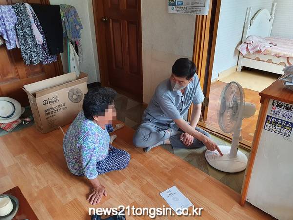 연일 계속되는 폭염에 선풍기가 제대로 작동되지 않아 열사병에 노출되기 쉬운 어르신들을 파악하여 재가노인지원서비스팀에서 스탠드형 리모컨 선풍기를 전달했다.