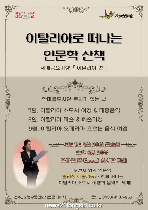 도봉구(구청장 이동진) 학마을도서관은 7월부터 10월까지 문화가 있는 날 <세계금요기행> ‘이탈리아 편’을 온라인 인문학 강연과 오페라 공연으로 진행한다.