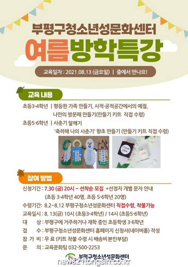 부평구(구청장 차준택)청소년성문화센터가 오는 30일 오후 8시 이후부터 ‘2021년 비대면 초등학생 여름방학특강’ 참가자 60명을 선착순으로 모집한다.