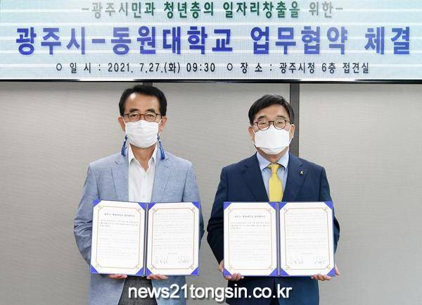 광주시는 지난 27일 시청 시장실에서 동원대학교와 일자리창출 교류·협력 기반 구축을 위한 업무협약을 체결했다.