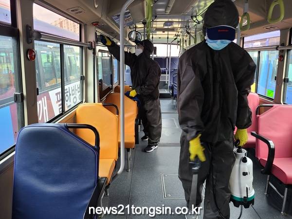 현재 시내버스 방역은 희망근로 지원사업 참여자 122명이 19곳에서 오전·오후 2교대로 근무 중이며, 운행 중인 980여 대의 버스를 1대당 일일 5 ~ 6회에 걸쳐 작업하고 있다.
