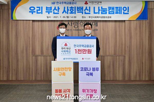 한국주택금융공사(HF, 사장 최준우)는 코로나19 장기화로 어려움을 겪고 있는 지역사회 취약계층을 돕기 위해 부산 사회복지공동모금회(회장 최금식)에 ‘우리부산 사회백신’ 나눔캠페인* 후원금을 전달했다고 26일 밝혔다.
