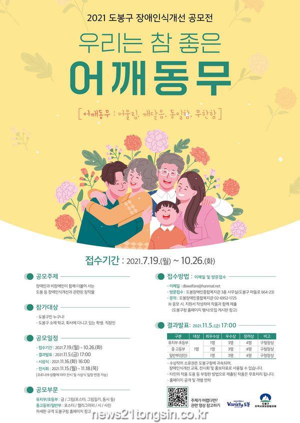 도봉구(구청장 이동진)와 도봉구 지역사회보장협의체 장애인분과에서 장애인과 비장애인이 더불어 사는 도봉을 만들고자 「2021년 장애인 인식개선 공모전 ‘우리는 참 좋은 어깨동무’」을 개최한다.