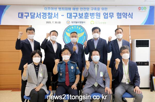 (대구=뉴스21통신) 박창남기자 = 대구달서경찰서(서장 신동연)는 2021. 7. 30.(금) 대구보훈병원(원장 조영래)과 이주여성 범죄피해 예방을 위한 업무협약식을 개최했다.