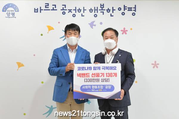 지난 3일, 사회적협동조합 공정(이사장 김재선)에서는 코로나19 극복을 위해 무더위 속에서 군민의 건강과 안전을 지키기 위해 고군분투하고 있는 보건소 직원, 군청 청사 주차장 관리 직원 등에게 격려물품 목걸이형 넥밴드 선풍기 130개를 전달하였다.