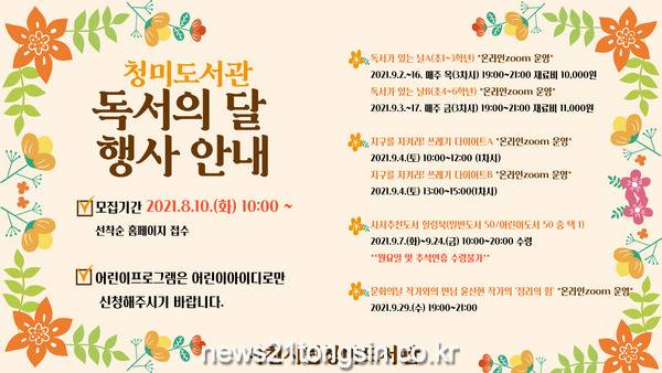 청미도서관 독서의달 행사는 8월 10일 화요일 오전10시부터 이천시통합도서관 홈페이지(www.icheonlib.go.kr)를 통해 선착순으로 접수 후 참여할 수 있다.