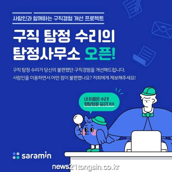 사람인은 고객들이 보다 친숙하게 프로젝트에 접근하고 참여할 수 있도록 구직 탐정인 ‘파랑새 수리’를 스토리텔러로 세우고, ‘수리의 탐정 사무소’라는 소통 페이지를 오픈 했다. 사람인 이용자들이 수리의 의뢰인이 돼 서비스를 이용하면서 불편했던 점이나 구직 활동 중 겪은 어려움을 제보하면, 이를 수리가 듣고 해결하는 컨셉이다. 모아진 제보들은 실제 서비스 기획자들이 꼼꼼하게 검토해 서비스 개선 및 기획에 적극 활용할 계획이다.