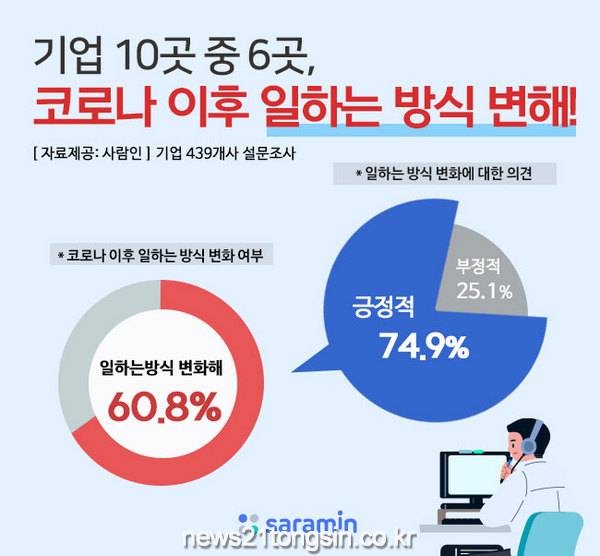 구인구직 매칭 플랫폼 사람인(www.saramin.co.kr. 대표 김용환)이 기업 439개사를 대상으로 ‘코로나19로 인한 일하는 방식 변화’를 조사한 결과, 60.8%가 ‘일하는 방식이 변화했다’고 밝혔다.