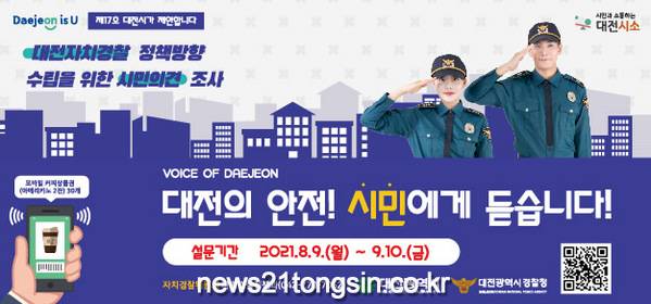 대전자치경찰위원회는 자치경찰제 전면시행과 내년 정책 추진방향을 위해 9일부터 내달 10일까지 ‘VOICE of Daejeon, 대전의 안전! 시민에게 듣습니다’라는 주제로 설문조사를 진행한다.