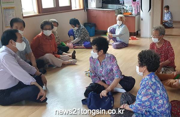 김주수 군수는 지난 6일 경로당을 찾아 더위로 건강이 우려되는 어르신들을 만났으며, 에어컨 가동여부와 코로나19 방역 실태 등을 꼼꼼히 점검했다.