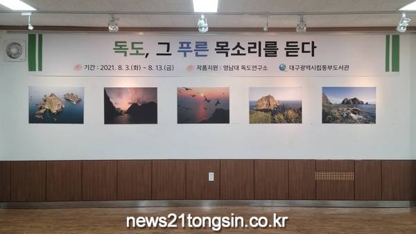 (대구=뉴스21통신) 유재원기자 = 대구동부도서관은 8월 3일(화)부터 8월 13일(금)까지 1층 전시실에서 영남대학교 독도연구소에서 주관하는 독도 독도전시회 「독도, 그 푸른 목소리를 듣다」를 개최한다.