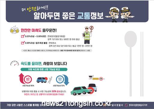 교통안전 홍보 문구가 인쇄된 테이블 세팅지 내용에는 “한잔만 마셔도 음주운전!!, 속도를 줄이면, 사람이 보입니다”라는 문구로 제작되어 시민들에게 음주운전 단속수치와 처벌규정 안내그리고 안전속도 5030 제도 시행으로 인한 교통사망사고 감소 효과 등 알아두면 유익한 교통정보 내용을 담고 있다.