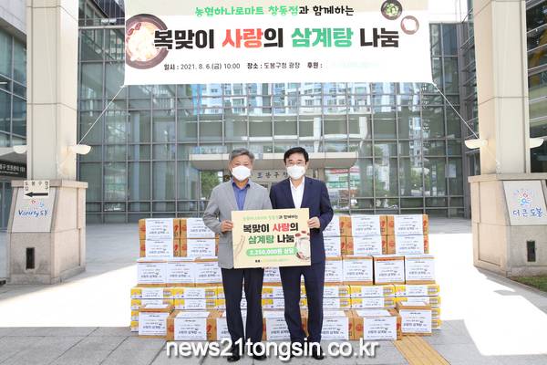 도봉구(구청장 이동진)는 8월 6일 구청 앞 광장에서 농협 하나로마트 창동점의 후원으로 코로나19와 무더위로 지쳐있는 저소득 어르신을 위한 「복맞이 사랑의 삼계탕 나눔」 전달식을 진행했다.