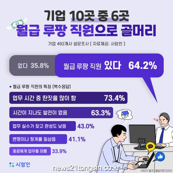 구인구직 매칭 플랫폼 사람인(www.saramin.co.kr, 대표 김용환)이 기업 492개사를 대상으로 ‘월급 루팡 직원 현황’을 조사한 결과, 64.2%가 ‘있다’고 밝혔다.