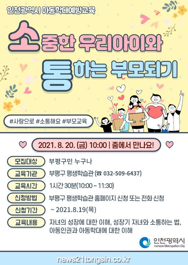 부평구(구청장 차준택)는 오는 20일 오전 10시부터 ‘소중한 우리 아이와 통하는 부모 되기’를 주제로 비대면 온라인 아동학대 예방교육을 진행한다.