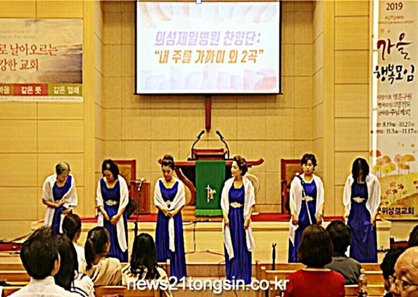 암재활 의성제일요양병원(이사장 장윤영)은 15일 오후 4시 의성읍 철파교회에서 피아니스트인 김병수 책임 간호사의 ‘예수를 나의 구주 삼고 외 1곡’ 피아노 독주와 ‘에바다 찬양단’의 ‘온 세상 위하여 나 복음 전하리 외 4곡’을 찬양했으며, 이날 광복절을 맞이하여 에바다 찬양단은 태극기를 흔들며 특별한 찬송가를 불렀다.