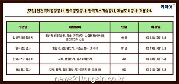 취업포털 커리어가 인천국제공항공사, 한국공항공사, 한국가스기술공사, 하남도시공사 등 채용 소식을 발표했다.