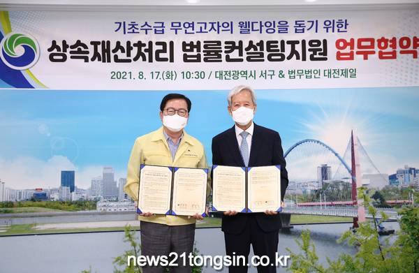 대전 서구(구청장 장종태)는 17일 구청 갑천누리실에서 법무법인 대전제일(대표 한원규)과 기초수급 무연고자 상속재산 법률컨설팅 지원을 위한 업무 협약식을 개최했다.