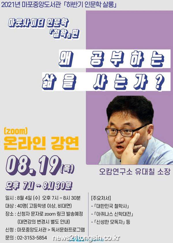 오는 19일 오후 7시부터 진행되는 1회차 특강은 ‘철학’편으로 유대칠 오캄연구소 소장이 ‘왜 공부하는 삶을 사는가? 철학자에게 묻는다면’이라는 주제로 공부란 무엇인지 그리고 우리는 왜 철학을 공부해야하는지 등에 대해 이야기한다.