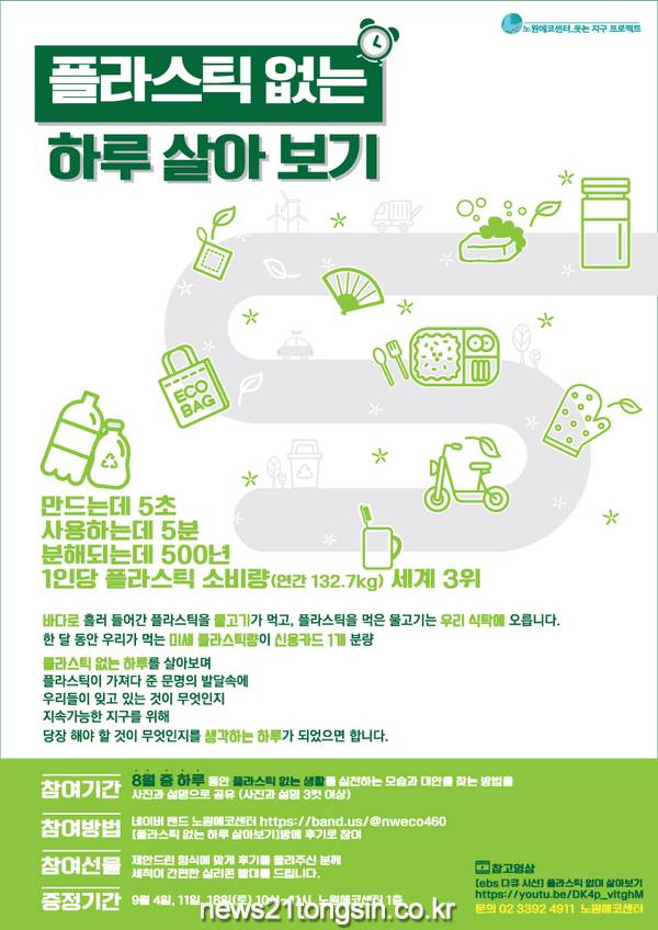 참여 방법은 간단하다. 노원에코센터(http://www.nwecocenter.or.kr/) 공지사항의 ‘2021 웃는 지구 프로젝트 플라스틱 없는 하루 살아보기’ 또는 네이버밴드 노원에코센터(https://band.us/@nweco460)에 접속해 사진과 설명 3컷 이상을 게시하면 된다. 참고할 수 있도록, 홈페이지에 다양한 예시들을 게시했다.