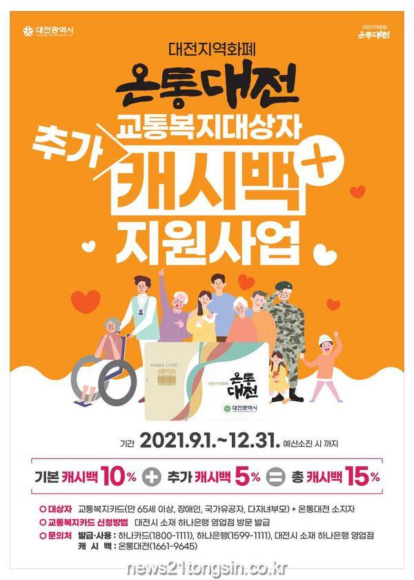 시는 9월부터 교통복지카드 발급자가 온통대전으로 결제 시, 10%의 기본 캐시백에 5%의 추가 캐시백을 더해 총 15% 캐시백을 예산소진 시까지 지급한다는 방침이다.