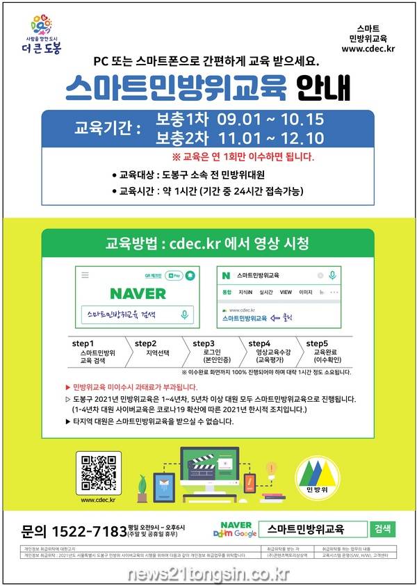 보충 교육은 1차 9월1일부터 10월15일까지, 2차 11월1일부터 12월10일까지로 두 번에 걸쳐 실시되며, 스마트민방위교육(www.cdec.kr) 혹은 전자통지서 링크를 통해 PC나 스마트폰으로 교육을 수강할 수 있다. 전자통지서는 카카오페이·네이버·KT를 통해 알림톡 형태로 교육 대상자에게 순차적으로 발송된다.