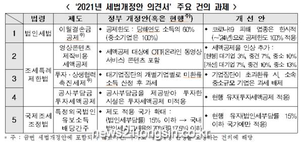 현행법에서는 영화, 드라마 등 영상콘텐츠 제작비용의 일정액을 법인세에서 공제해주고 있는데, 개정안은 세액공제 대상에 OTT(온라인 동영상 서비스) 콘텐츠 제작비용을 포함하는 방안을 규정하였다.