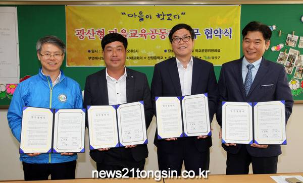 1일 광주 광산구(구청장 민형배)가 산정중학교에서 하남동 부영1애시앙1차 아파트 입주자대표회의, 산정중, 산정중학부모회와 함께 ‘광산형 마을교육공동체 조성을 위한 업무협약식’을 열었다.
