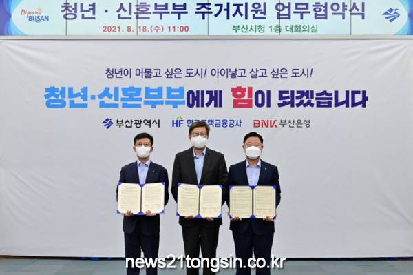 한국주택금융공사(HF, 사장 최준우)는 부산시(시장 박형준), BNK부산은행(행장 안감찬)과 함께 부산시 무주택 신혼부부와 청년이 이용하는 협약전세자금보증의 지원 확대를 위해 ‘부산시 청년ㆍ신혼부부 주택임차보증금 지원사업 업무협약’을 체결한다고 지난 18일 밝혔다.