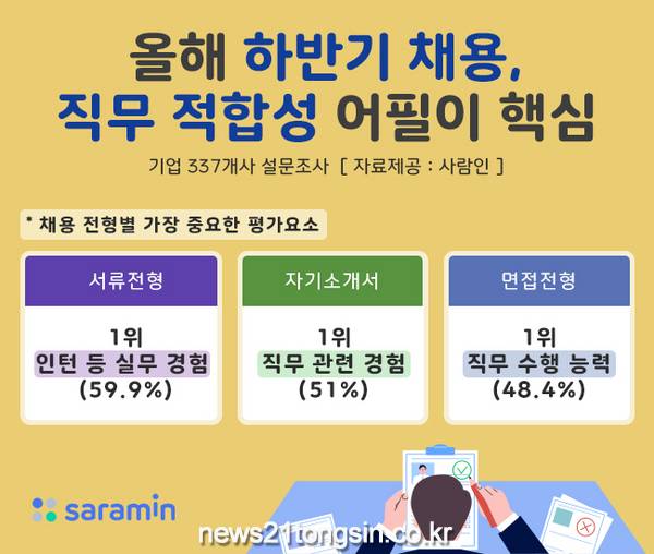 하반기 좁은 채용문을 뚫기 위해 취준생들이 가장 중점적으로 준비해야 할 채용 전형과 평가 요소는 무엇일까? 구인구직 매칭 플랫폼 사람인(www.saramin.co.kr, 대표 김용환)이 기업 337개사를 대상으로 ‘하반기 전형별 채용 평가’에 대해 조사한 결과를 정리했다.