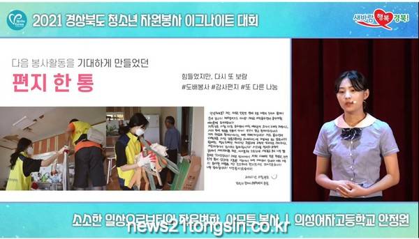 의성군은 ‘2021 경상북도 청소년 자원봉사 이그나이트 대회’에서 의성여자고등학교 3학년 안정원 학생이 대상(행정안전부장관상)을 수상했다고 밝혔다.