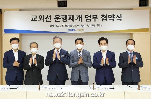 이재명 지사는 23일 경기도청에서 이재준 고양시장, 안병용 의정부시장, 김종석 양주부시장, 김한영 국가철도공단이사장, 정왕국 한국철도공사 사장직무대행과 이 같은 내용의 ‘교외선 운행재개 업무협약’을 체결했다.