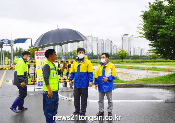 (뉴스21통신/박형만기자)= 박태완 중구청장이 23일 성남둔치 공영주차장을 방문해 제12호 태풍 ‘오마이스’ 북상에 따른 사전 현장 점검을 하고 있다.