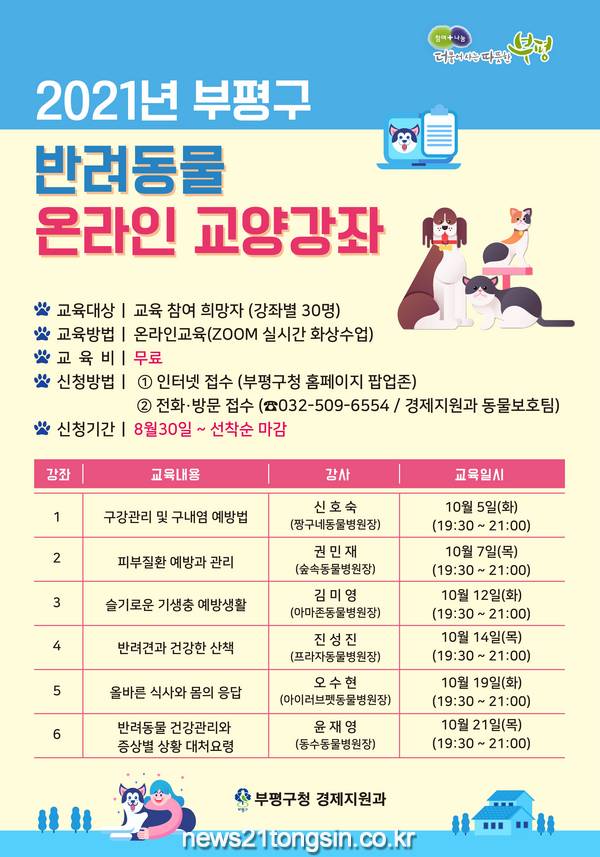 부평구(구청장 차준택)가 오는 30일부터 ‘반려동물 온라인 교양강좌’에 참여할 주민을 모집한다.