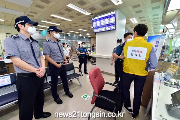 구는 민원실 내 구축된 비상벨 정상작동 여부를 확인하고 경찰의 신속한 출동 협조체계를 구축해 유사시 방문 민원인과 직원들의 안전을 확보하는데 중점을 뒀으며, 민원인 제압 상황을 가정한 훈련도 연출했다.