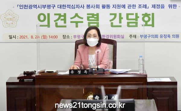 부평구의회 유정옥 의원(부평3, 산곡3·4, 십정1·2동, 국민의힘)은 지난 8월 23일 오후 2시 부평구의회 도시환경위원회실에서 「인천광역시부평구 대한적십자사 봉사회 활동 지원에 관한 조례」 제정을 위한 의견수렴 간담회를 실시하였다.