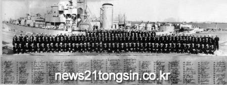사진 하단에는 알미란테 파디야함에 탑승한 해군 전원의 친필 서명이 함께 있다.