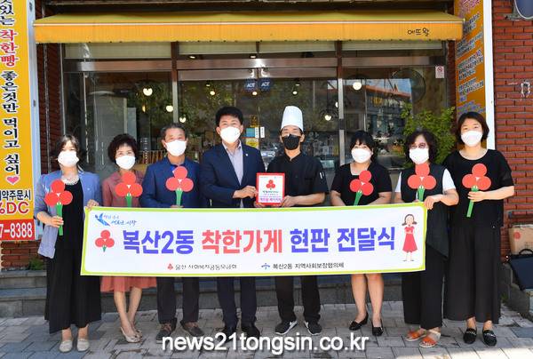 착한가게 현판을 전달한 뒤 기념촬영을 하고 있다.