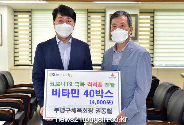 부평구(구청장 차준택)는 26일 권동철 부평구 체육회장으로부터 비타민 40상자(총 4천800포)를 기탁 받았다.